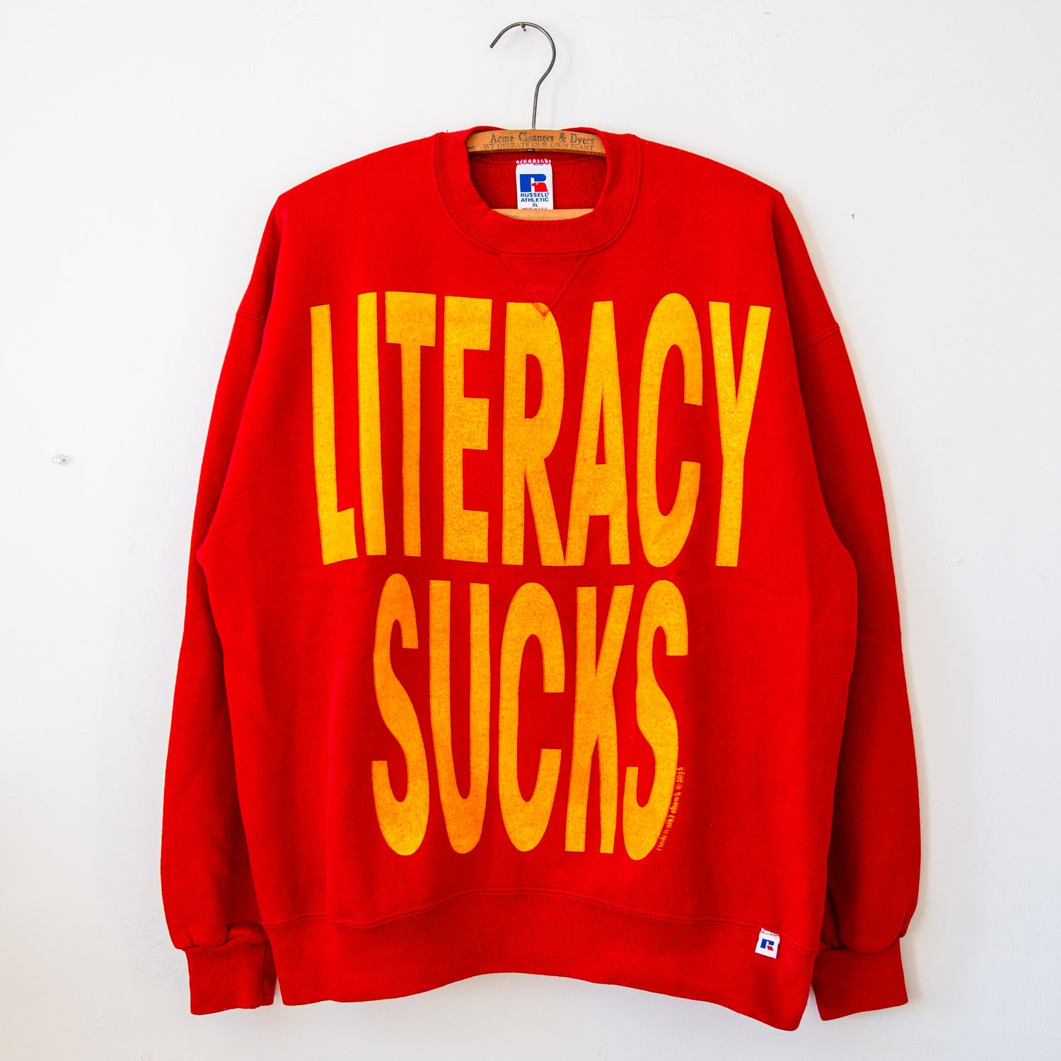 Printed onto a 90s Russell crewneck sweatshirt, tagged XL (25" pit-to-pit / 26.5" shoulder-to-hem)