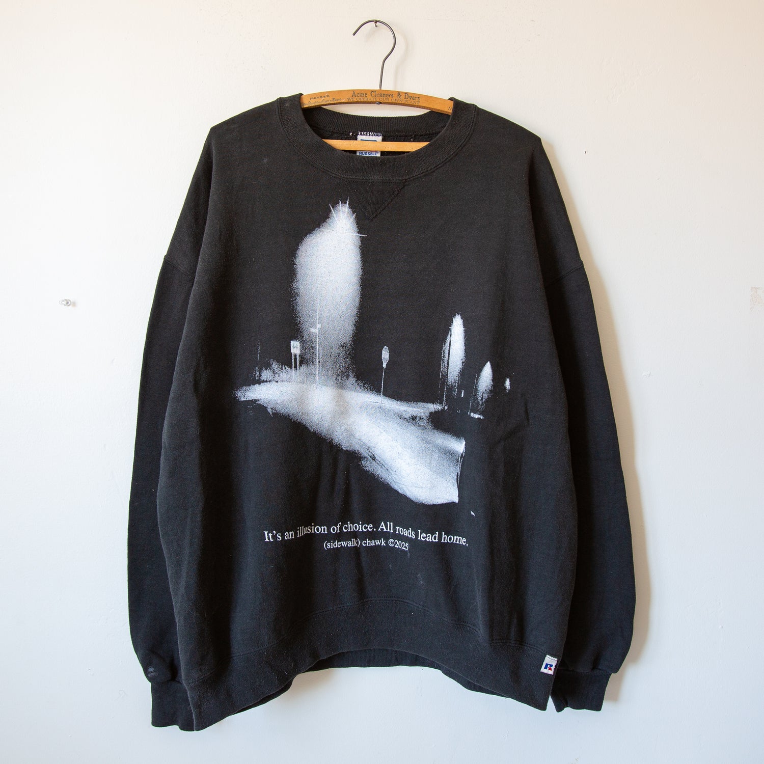 Printed onto a 90s Russell crewneck, tagged XXL fits XL (26.5" pit-to-pit / 27" shoulder-to-hem)