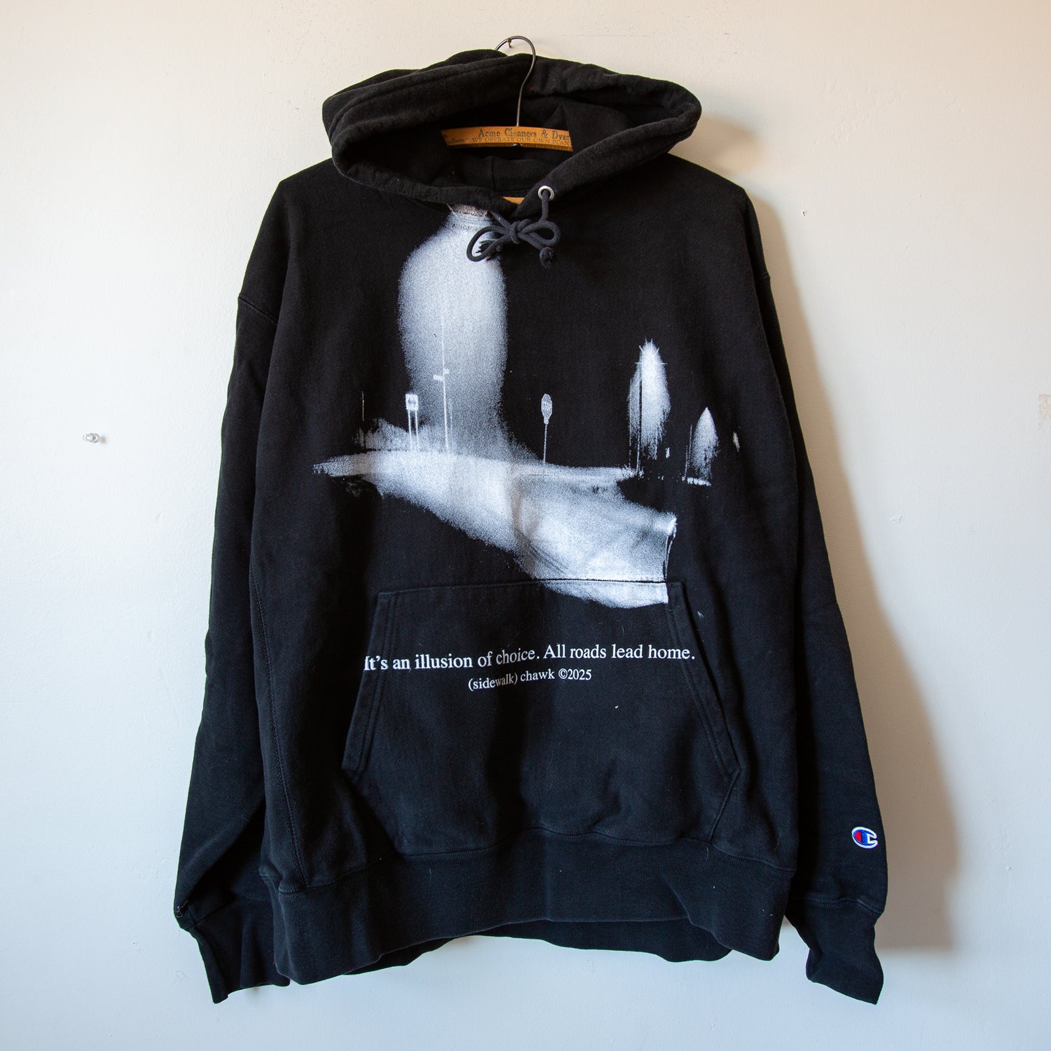 Printed onto a Champion Reverse Weave hoodie, tagged XL (26" pit-to-pit / 27" shoulder-to-hem)